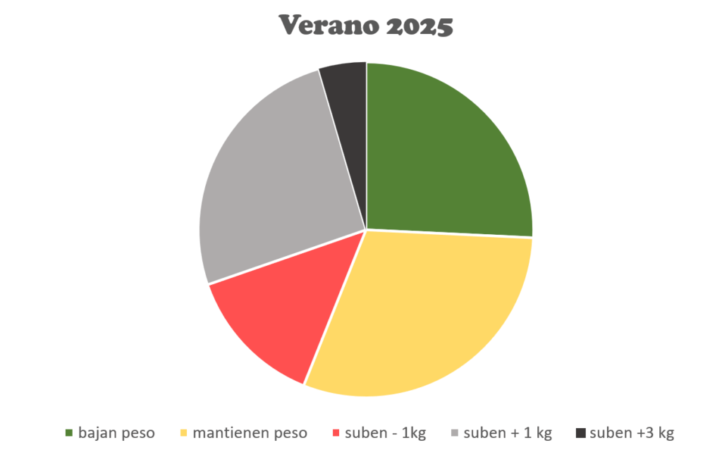 • Sin embargo, aumenta el porcentaje de las personas que suben 1 kg de peso o más, pasando del 14,6% de 2024 al 25.75% en 2025. Es decir, este grupo y el analizado en el punto anterior, no sufre cambios significativos de un año a otro en su sumatorio.